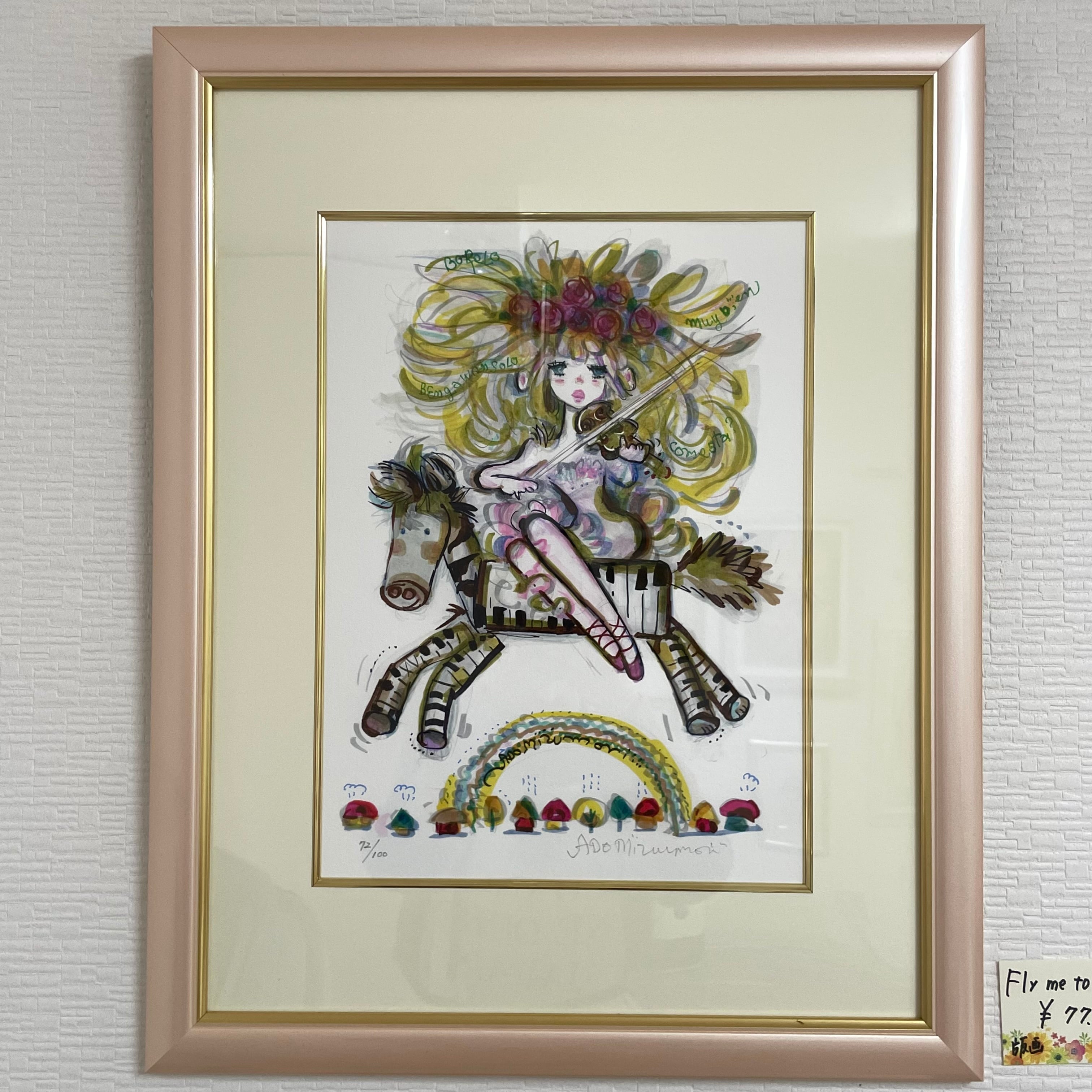 画面サイズ:35,5×26,5㎝ 額サイズ:約56×45㎝ 数年前のポスターカレンダーのための描き下ろし。珍しくゴージャスで可愛いヴァイオリニストの女の子が描かれています。お馬さん?(シマウマさん?)に乗って・・☆水森亜土直筆サイン入り、額付。送料・梱包料無料でお届けいたします。